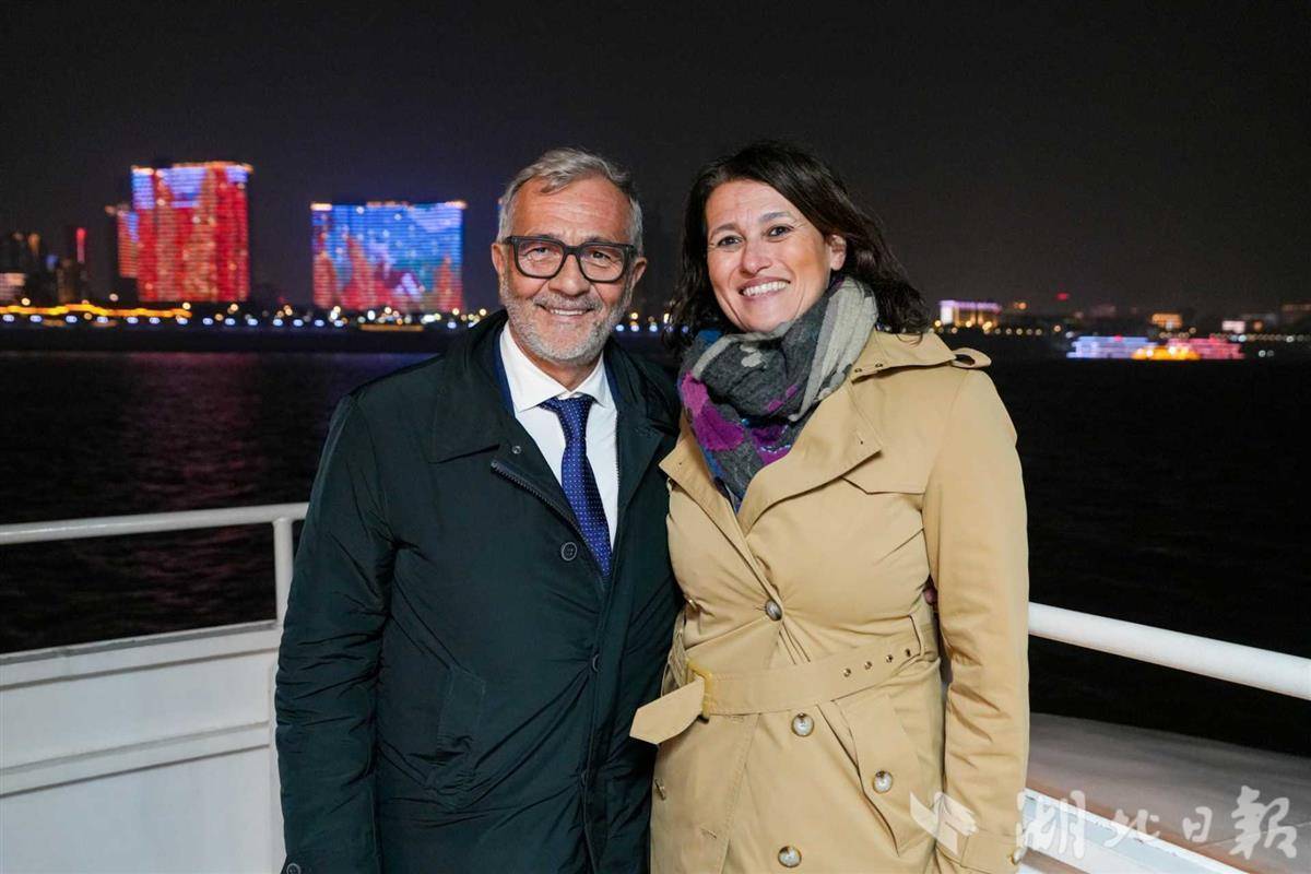 船身缓缓离岸,代表团员们纷纷举手机拍摄——黄鹤楼巍峨耸立于光影之中,龟山电视塔如明珠点亮夜空,长江二桥拉出金色的弧线。代表团中不时响起意大利语的赞叹声。