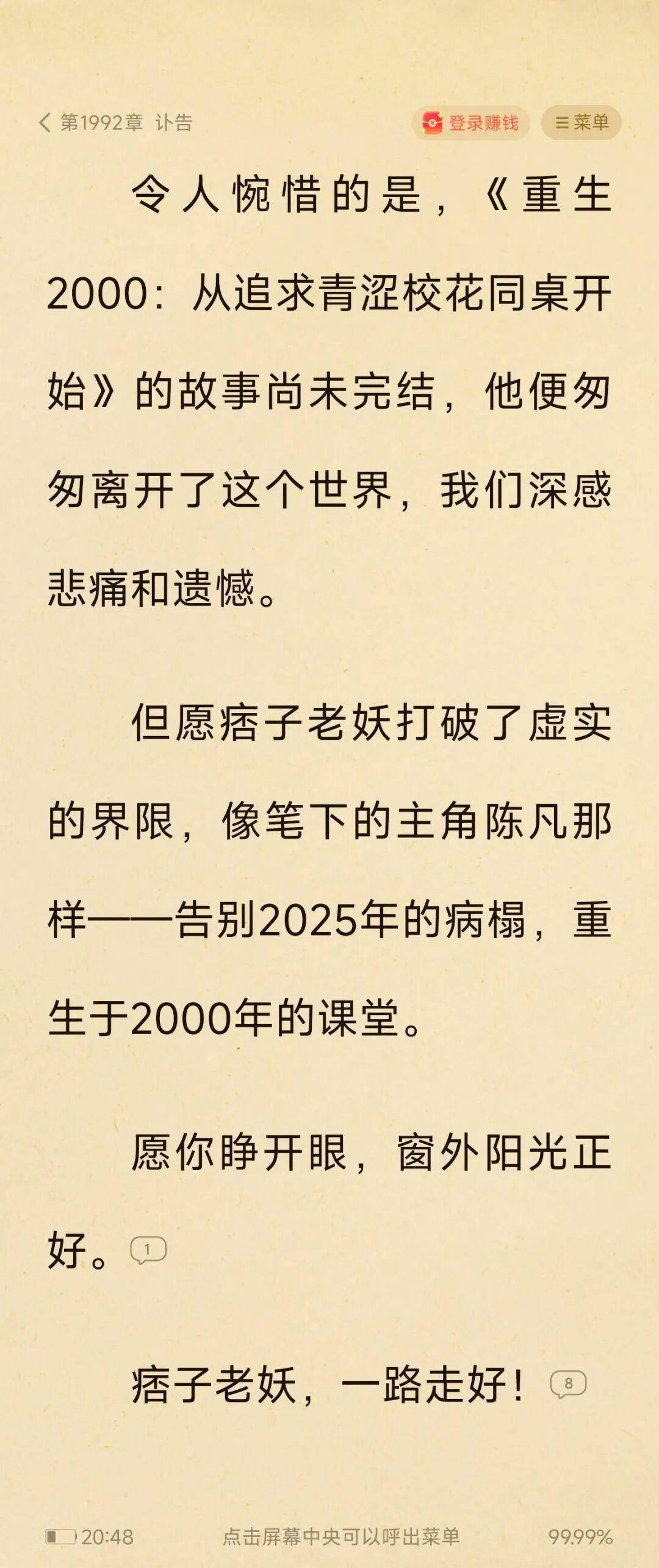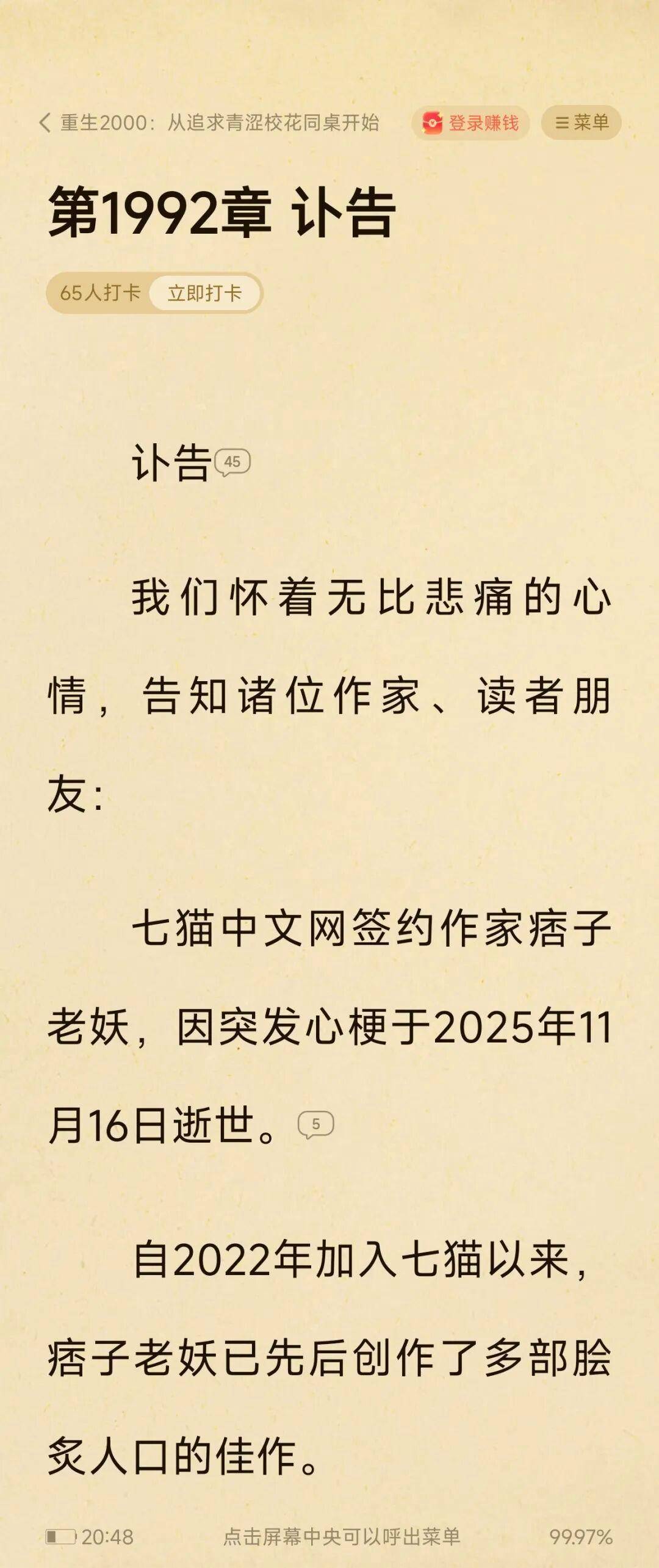近日,多位网文博主发文称,七猫中文网签约作家“痞子老妖”于2025年11月16日因突发心梗离世。记者查询到,其最后一部小说《重生2000》第1991章末尾,自称“痞子老妖”爱人发布了一份讣告,称作者“痞子老妖”11月16日因为心梗突然离世,她帮“痞子老妖”为小说补充上了结尾。12月10日,七猫中文网在1992章再次发布讣告,送别“痞子老妖”。