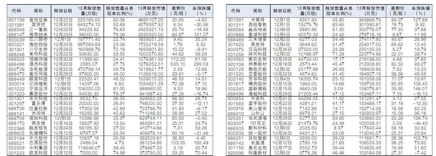 根据Wind数据统计,12月A股限售股上市数量为383.49亿股,以12月1日收盘价计算,市值约为4205.46亿元,为年内单月第三高。其中,56股12月解禁市值超过10亿元,首创证券、国货航、三一重能、微导纳米、四川路桥等股解禁市值居前。