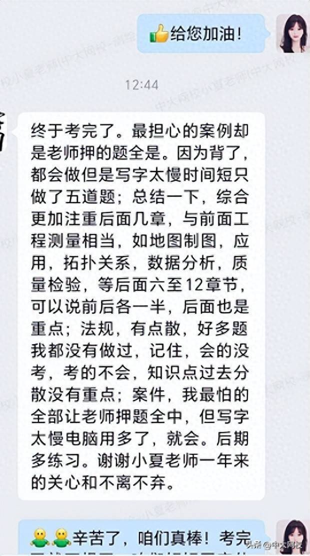 学员反馈:“终于考完了。最担心的案例却是老师押的题全是。因为背了,都会做但是写字太慢时间短只做了五道题;总结一下,综合更加注重后面几章,与前面工程测量相当,如地图制图,应用,拓扑关系,数据分析,质量检验,等后面六至12章节,可以说前后各一半,后面也是重点;法规,有点散,好多题我都没有做过,记住,会的没考,考的不会,知识点过去分散没有重点;案件,我最怕的全部让老师押题全中,但写字太慢电脑用多了,就会。后期多练习。谢谢小夏老师一年来的关心和不离不弃。”