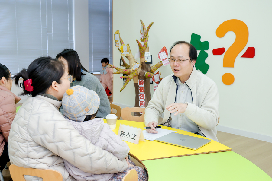 “会照料、会抚爱、会陪玩、会倾听、会沟通、会等待、会放手”,陈小文用7个“会”概括家长们要“修炼”的本领。和家长们交流后,他发现,对如今的年轻父母而言,“会抚爱”和“会倾听”难度系数最高。女孩露露(化名)2岁多,妈妈总是担心孩子过于谨慎,内向,经过陈小文启发,她渐渐发现了自己的问题所在——兴许是把工作中的风风火火也带进了生活,往往孩子还没有回答,她就自己预设了答案,发出一串“是不是”“对不对”的问题,挤压了孩子的表达空间。同样是2岁多,男孩然然(化名)让父母头疼的点在于“脾气不好,会忍不住打小朋友”,在父母的描述中,陈小文发现,和一些上班族一样,然然父母平时将然然放在爷爷奶奶家,只有双休日去陪伴孩子,也很头疼怎样和说话都不利索的小朋友,产生共同话题。父母来去匆匆的身影,让小家伙没有了安全感,也成了他内心烦躁的根源。“父母再忙,也要给孩子创造有情感浓度的交流仪式。”陈小文想对年轻父母说。